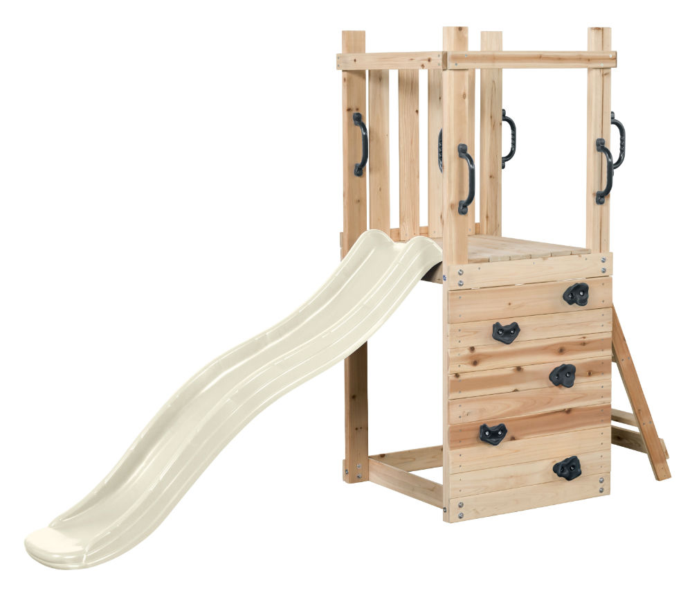 Het Houten speeltoestel Irma met pastel witte glijbaan. Een geweldige aanvulling voor jonge kinderen die houden van buiten spelen. Een veelzijdige speeltoren met verschillende mogelijkheden om te klimmen, glijden en zich te verstoppen onder het platform.